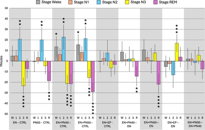 | ▲ 수면 거시구조 변화에 대한 환경 소음, PN 및 귀마개 착용의 효과에 대한 사후 대비 분석 계획. CTRL: 소음 없는 대조군 밤; EN: 환경 소음만; PN50: 50 dBA의 일정한 핑크 노이즈만; EN + PN40: 환경 소음 + 40 dBA의 일정한 PN; EN + PN50: 환경 소음 + 50 dBA의 일정한 PN; EN + EP: 환경 소음 + 귀마개; 수면 단계는 W: 각성; 1: N1; 2: N2; 3: N3; R: REM으로 약칭. (출처:Efficacy of pink noise and earplugs for mitigating the effects of intermittent environmental noise exposure on sleep / 02 February 2026 / SLEEP / Oxford Academic) |