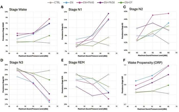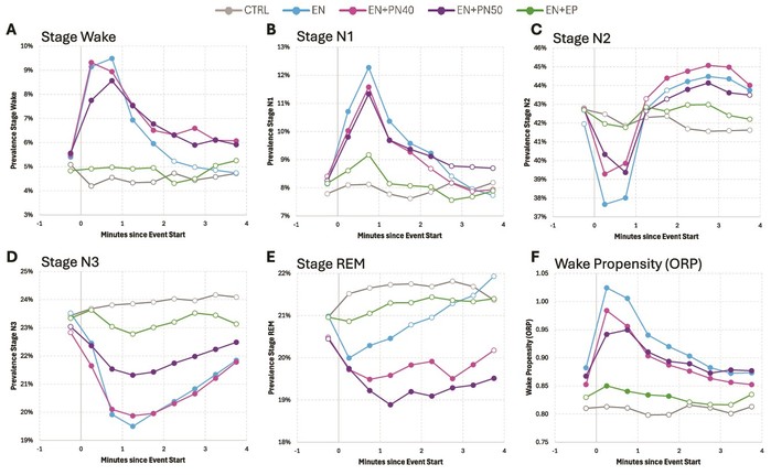 | ▲ 소음 발생 30초 전부터 소음 발생 4분 후까지의 기간 동안 수면 단계 빈도(수면밀도; 패널 A-E) 및 ORP(오즈비 곱; 패널 F)의 변화를 나타낸 그래프. (출처:Efficacy of pink noise and earplugs for mitigating the effects of intermittent environmental noise exposure on sleep / 02 February 2026 / SLEEP / Oxford Academic) |