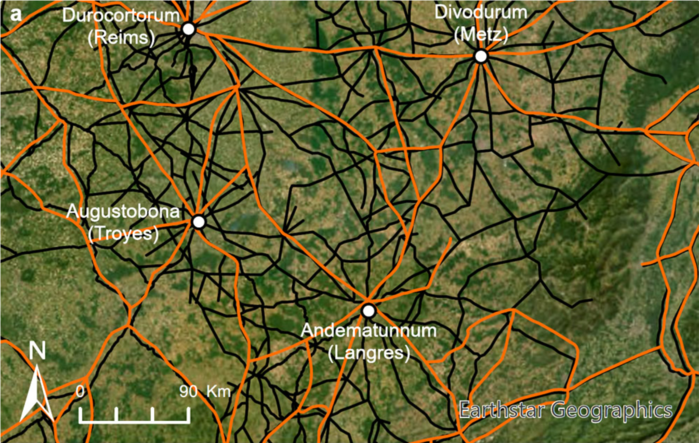 | ▲ 프랑스 한 지역의 기존에 알려진 로마 도로(주황색)와 새롭게 지도에 표시된 도로(검은색)를 비교한 그림. © de Soto et al./ Scientific Data, CC-by 4.0 |