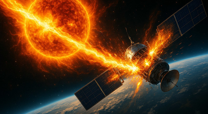하지만 이것이 위성에 대한 유일한 위험은 아니다. 플레어와 이후 도착하는 플라즈마는 강화된 방사선과 고에너지 입자로 위성을 폭격하여 민감한 컴퓨터 기술과 전자 장치에 독이 된다. 점점 더 많은 회로가 고장 나고, 비트 오류와 단락으로 인해 탑재된 컴퓨터가 마비된다. 추적 시스템의 위성은 막대한 영향을 받고 GPS 항법도 거의 불가능하다. 많은 위성 센서도 고장 나고, 배터리 충전 장애는 혼란을 더욱 가중시킨다.