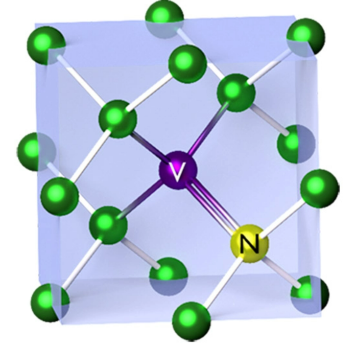 | ▲ 다이아몬드 탄소 격자 내에 질소 원자와 그 옆에 있는 빈자리로 구성된 NV 오점© NIST |