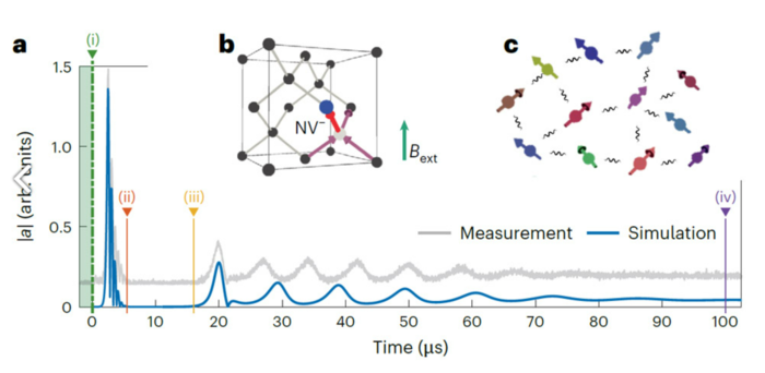 | ▲ 실험 및 시뮬레이션에서 관찰된 초방사 및 후속 펄스(a), NV 결함의 모식도(b), 그리고 결함 스핀들의 쌍별 상호작용(c). © Kersten et al./ Nature Physics, CC-by 4.0 |