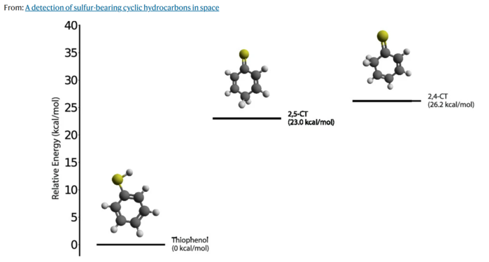 | ▲ 구조와 에너지는 CAM-B3LYP/cc-pCV5Z 이론 수준에서 도출되었다. (출처:Published: 23 January 2026 / A detection of sulfur-bearing cyclic hydrocarbons in space / nature astronomy) |